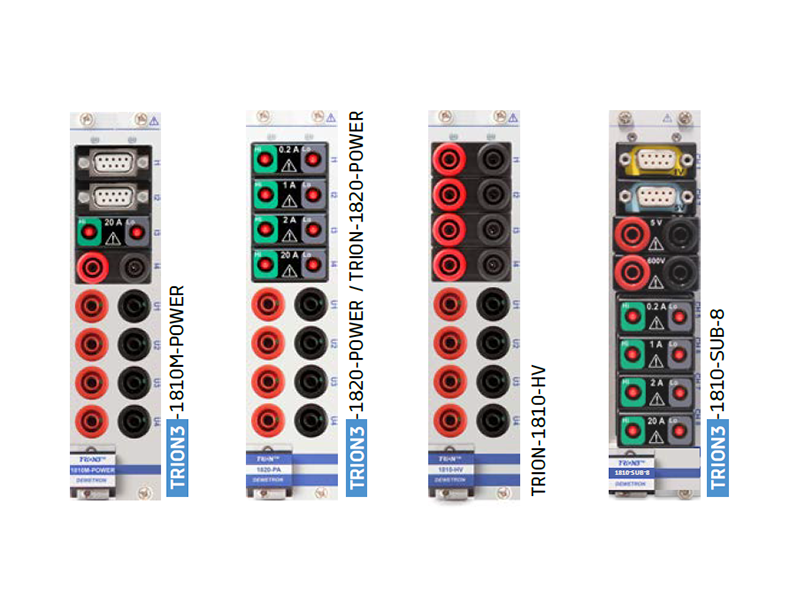 用戶可在不同的類型的TRION和TRION3電力測試板卡中選擇,用于4電壓&4電流電力測試,板卡的采樣率可達10MS/s,由于POWER板卡模塊化設計,每張板卡的4個插槽(TRION3-1810-SUB-8的8個插槽)可以配備不同的SUB模塊(電流直采模塊或者電壓模塊)以連接電壓或者電流傳感器。